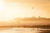 Prachtig licht schijnt over het kustlandschap bij Zoutelande, waar de meeuwen na een vlucht met de harde wind uitrusten op het strand.