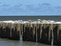 Meeuwen rusten even uit op de strandpalen
