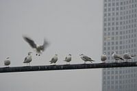Meeuwen rusten uit op een staalkabel. Dit beeld is genomen aan de nieuwe maas met de Deloitte toren op de achtergrond