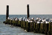 Deze meeuwen zaten op een golfbreker zichzelf op te warmen in het zonlicht bij het strand van Westkapelle,Nederland.
