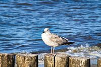 Meeuwen op een krib in Zingst aan de Baltische Zee, reikend in zee. Wilde vogels aan de kust.