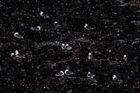 Meeuwen in een sneeuwstorm in Noorwegen.
