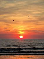 Prachtige zonsondergang met 2 vliegende meeuwen.