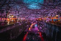 De Meguro rivier in het centrum van Tokyo, Japan, tijdens de lente waar de kersenbloesems of sakura mooi verlicht worden met lantaarns en lampionen.