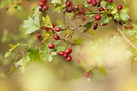 Een tak met de rode bessen van de meidoorn. De onscherpe achtergrond geeft sfeer aan de foto. De foto is gemaakt in bos Nieuw Wulven in de gemeente Bunnik.