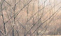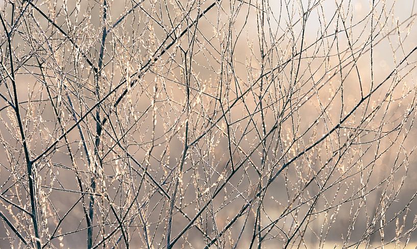 Close up van met dauwdruppels bedekte takken tussen de nevel op Meinerswijk in Arnhem, Gelderland. De zon is net op en kleurt de lucht goud.