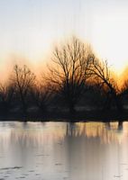 Meervoudige belichting van enkele bomen en water op uiterwaardpark Meinerswijk in Arnhem, Gelderland. Er werden enkele foto's samengevoegd in de camera, wat voor een kunstig effect zorgt. De zon komt op en kleurt de lucht prachtig oranje.
