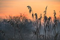 Close up van grassen tussen de nevel op Meinerswijk in Arnhem, Gelderland. De zon komt op en kleurt de lucht prachtig oranje.