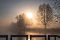 Landschap op het uiterwaardpark van Meinerswijk in Arnhem, Gelderland, met de omheining van het ponton op de voorgrond, en een fietser door het mistige landschap op de achtergrond. Dit alles tijdens het gouden uurtje na zonsopkomst