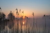 Landschap op het uiterwaardpark van Meinerswijk in Arnhem, Gelderland, met op de voorgrond het riet dat langs het water groeit, en op de doffe achtergrond de opkomende zon in een mistig landschap