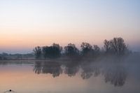 Landschap op het uiterwaardpark van Meinerswijk in Arnhem, Gelderland, waar de mist over het water hangt, enkele vogels zwemmen, en de lucht prachtig kleurt tijdens het blauwe uurtje voor zonsopkomst
