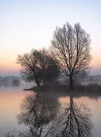 Portret op het uiterwaardpark van Meinerswijk in Arnhem, Gelderland, met zicht op enkele bomen langs het meer, tijdens een prachtig blauw uurtje voor zonsopkomst