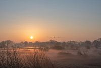 Landschap op het uiterwaardpark van Meinerswijk in Arnhem, Gelderland, waar de nevel over de grond hangt, de zon langzaam opkomt, en de ganzen overvliegen