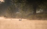 Landschap op het uiterwaardpark van Meinerswijk in Arnhem, Gelderland, waar een zwaan zwemt op het grote meer in de nevel, met op de achtergrond de oevers, tijdens het gouden uurtje na zonsopkomst