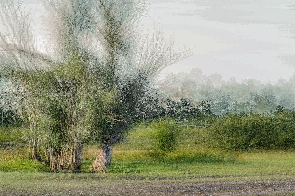 Landschap op uiterwaardpark Meinerswijk in Arnhem, Gelderland, langs de Rijn, waar gebruik is gemaakt van meervoudige belichting. 10 Foto's zijn samengevoegd, wat voor een abstract en schilderachtig effect zorgt.