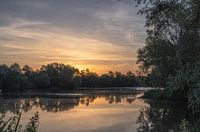 Landschap op uiterwaardpark Meinerswijk in Arnhem, Gelderland, langs de Rijn, waar de zon opkomt achter de bomen, met een prachtig gekleurde lucht.