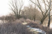 Landschap op uiterwaardpark Meinerswijk in Arnhem, Gelderland. Het is een koude winterochtend met wat sneeuw. De foto is gemaakt tijdens het gouden uur na zonsopkomst.