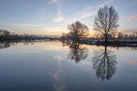Landschap op uiterwaardpark Meinerswijk in Arnhem, Gelderland. Het is een koude winterochtend en de lucht kleurt oranje door de bijna opkomende zon. De bomen reflecteren in het water.