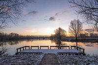 Landschap op uiterwaardpark Meinerswijk in Arnhem, Gelderland. Het is een koude winterochtend met wat sneeuw en de lucht kleurt oranje door de bijna opkomende zon.