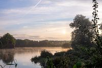 Landschap op het uiterwaardpark van Meinerswijk in Arnhem, Gelderland, met zicht op een watervlakte waar een laagje nevel over hangt, tijdens het gouden uurtje van de ochtend