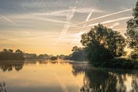 Landschap op uiterwaardpark Meinerswijk in Arnhem, Gelderland. De zon komt op en er hangt wat grondmist. De bomen reflecteren in het water.