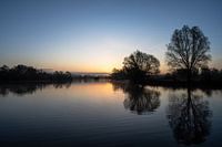 Landschap op het uiterwaardenpark Meinerswijk, met zicht op het grote meer. De zon komt op en kleurt de lucht mooi oranje.