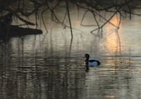 Landschap op uiterwaardpark Meinerswijk met zicht op een kuifeend op het water, in het gouden licht van de opkomende zon.