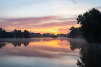 Landschap op het uiterwaardpark van Meinerswijk in Arnhem, Gelderland, met zicht op een watervlakte waarover de zon prachtig opkomt
