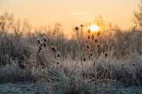 Close up van een grote kaardenbol struik, helemaal bedekt met rijp, met op de achtergrond het gouden licht van de opkomende zon.
