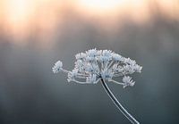 Close up van een gewone berenklauw, helemaal bedekt met rijp, met op de achtergrond het gouden licht van de opkomende zon.