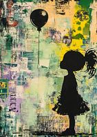 Meisje Ballon | Meisje Ballon - Dit is een urban geïnspireerd abstract schilderij waarop het silhouet van een klein meisje met een ballon is afgebeeld tegen een kleurrijke achtergrond vol diverse patronen en fragmenten van tekst, wat een speelse en dromerige sfeer oproept.
