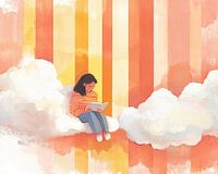 Meisje Boek - Op dit vrolijke schilderij zie je een meisje met een boek dat op een wolk zit, omringd door een achtergrond van warme, gestreepte kleuren die aan een zomerse zon doen denken.