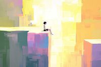 Meisje en Abstract | Zittend in Kleurrijke Abstractie - Op dit abstract schilderij zie je een meisje dat zittend op een rand van een kleurrijke ondergrond lijkt te reflecteren, omringd door zachte gele en paarse tinten die een dromerige sfeer creëren.