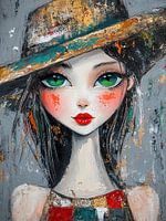 Meisje en Hoed | Meisje met Hoed - Op dit vrouwen schilderij zie je een meisje met grote, groene ogen en een opvallende rode lippenstift, die een hoed draagt met een kleurige rand, tegen een grijze achtergrond vol textuur.