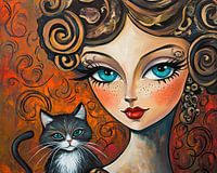 Details: vrouwen schilderij, grote ogen, kat, oranje achtergrond, moderne kunst, krullen, schattig, portret, kleurrijk, meisjes schilderij