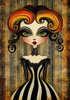 Meisje en Kleur | Gekleurde Haar - Op dit vrouwen schilderij zie je een meisje met grote ogen en een opvallende, gekleurde kapsel in een zwart-witte jurk met kant, wat het schilderij een moderne en speelse uitstraling geeft.