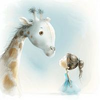 Een prachtige illustratie van een meisje en een giraffe, perfect om de muren van een baby- of kinderkamer op te fleuren. Deze tekening is met zorg gemaakt, waarbij het lijkt alsof zachte waterverf is gebruikt en rustige kleurenpaletten om een rustgevende sfeer te creëren.