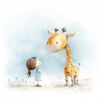 Een prachtige illustratie van een meisje en een giraffe, perfect om de muren van een baby- of kinderkamer op te fleuren. Deze tekening is met zorg gemaakt, waarbij het lijkt alsof zachte waterverf is gebruikt en rustige kleurenpaletten om een rustgevende sfeer te creëren.