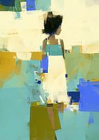 Meisje in Blauw - Op dit abstract schilderij zie je een meisje in een lichte jurk, omringd door vrolijke kleuren zoals blauw, groen en geel, die samen een dromerige sfeer creëren.
