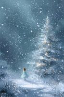 Een fragiel meisje in een lichtblauwe jurk staat stil in de sneeuw, oog in oog met een majestueus verlichte kerstboom. De vallende sneeuwvlokken zweven zacht door de ijle lucht, terwijl het licht van de boom op magische wijze reflecteert in het witte landschap. De compositie ademt rust, verwondering en een vleugje mystiek, alsof tijd…
