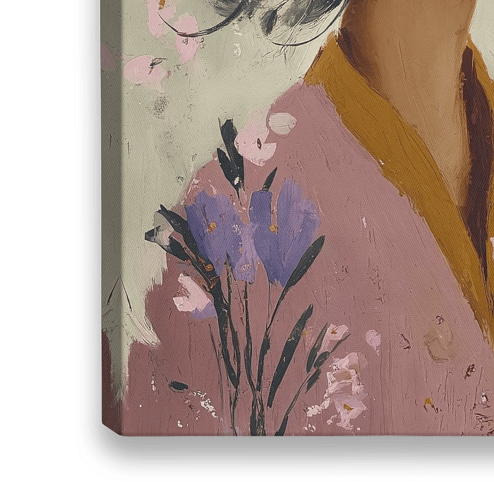 Een sfeervol portret in zachte pasteltinten waar elegantie en natuurlijke schoonheid samenkomen. De compositie toont een dromerig profiel omringd door paarse bloemen en roze bloesems. De warme oranje accenten in de oorbel en kleding contrasteren prachtig met de delicate lavendeltinten. Het geheel straalt een serene en etherische rust uit.