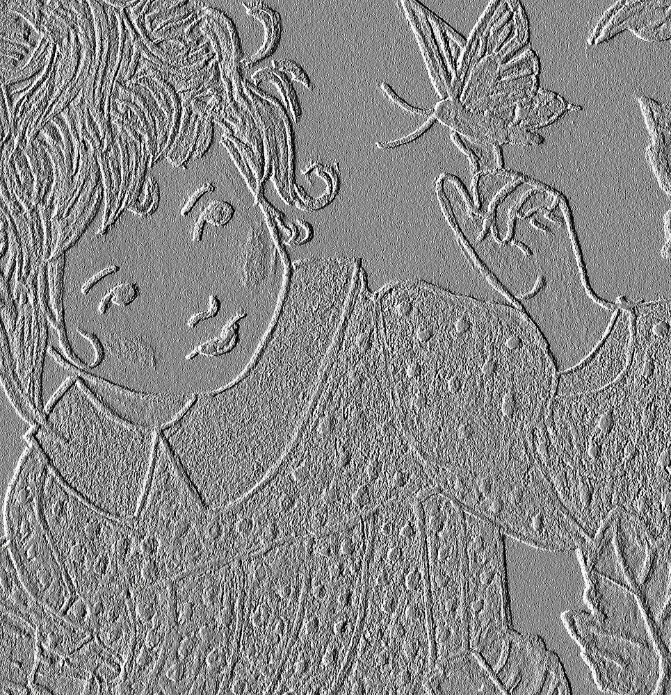 Een tekening van een meisje omringd door vlindertjes en bladeren en deze digitaal bewerkt.