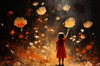 Meisje in een rode jurk in een droomlandschap. Kies zelf het formaat en de afmeting bij dit werk en maak het helemaal passend voor jouw interieur. Op dit werk raak je niet uitgekeken!
