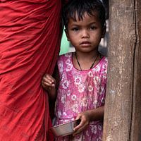 Meisje met eetbakje in roze jurkje kijkt gebiologeerd, veilig naast haar moeder in rode sari, hoe ik haar portretteer