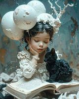 Een schattig meisje, met donker haar en een zwarte kat, leest aandachtig in een groot boek. De witte omgeving, witte ballonnen en het witte kanten jurkje, geven het geheel een retro uitstraling. Het beeld is met behulp van ai gegenereerd.