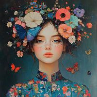 Details: bloemen schilderij, vrouw portret, vlinders, natuur kunst, figuratief…
