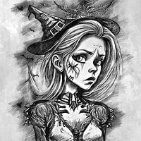 Digitale tekening, waarbij ik gebruik heb gemaakt van potlood en houtskool, van een meisje in een Halloween outfit.