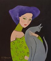 Dit werk is een expressief portret dat een gevoel van mysterie en elegantie oproept. Een vrouw, gehuld in een groene jurk met sierlijke spiralen, houdt teder een grijze kat vast. Haar houding straalt zowel kracht als zachtheid uit, terwijl haar paarse hoed een vleugje excentriciteit toevoegt aan het tafereel.