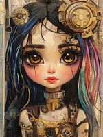 Meisje met Mechanische Outfit - Op dit vrouwen schilderij zie je een meisje met grote ogen, die een steampunkachtige outfit draagt en gekleed is met opvallende mechanische elementen, zoals een grote tandwielhoofddeksel en kleurrijk haar.