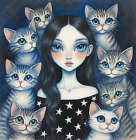 Een meisje met lang, donker haar en opvallende blauwe ogen wordt omringd door verschillende katten. De katten hebben ook felblauwe ogen, waardoor een harmonieus totaalbeeld ontstaat.